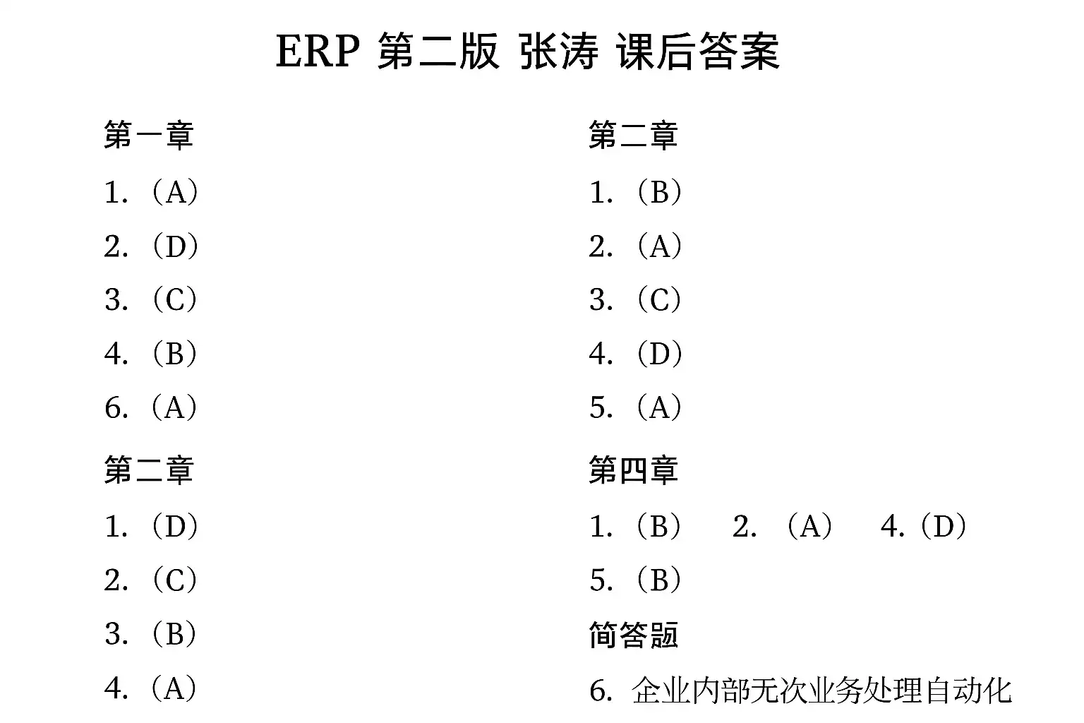 我最近在学习ERP第二版这本教材,听说张涛老师的课后答案很有帮助,但不太清楚它具体指的是什么?想了解一下ERP第二版张涛课后答案包含哪些内容,能帮我更好地理解课程吗?