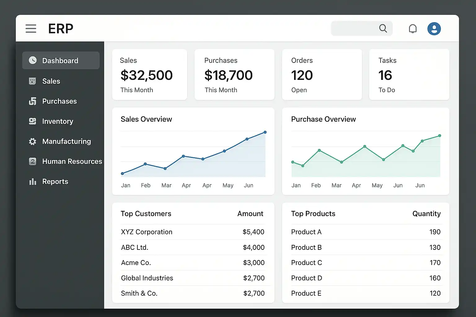 - 快速导航至采购、销售、库存、人力资源等模块。