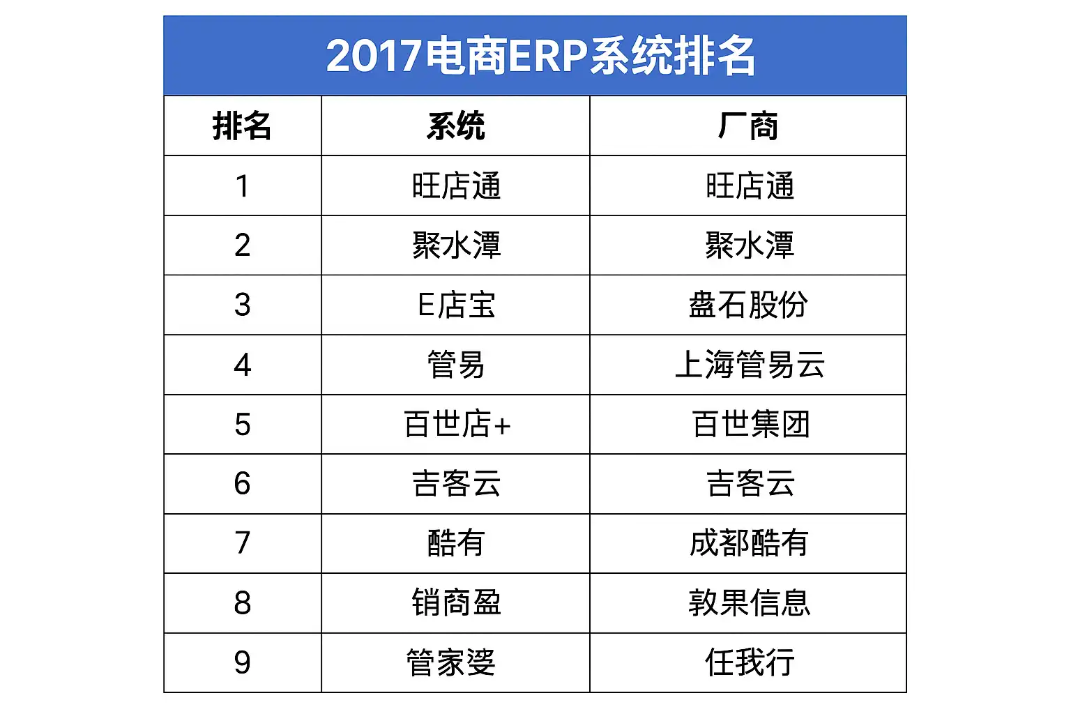 2017年中国电商ERP系统市场呈现多元化发展格局,不同类型的产品满足了不同规模及发展阶段企业的需求。以下是当年主流电商ERP系统排名及基本对比: