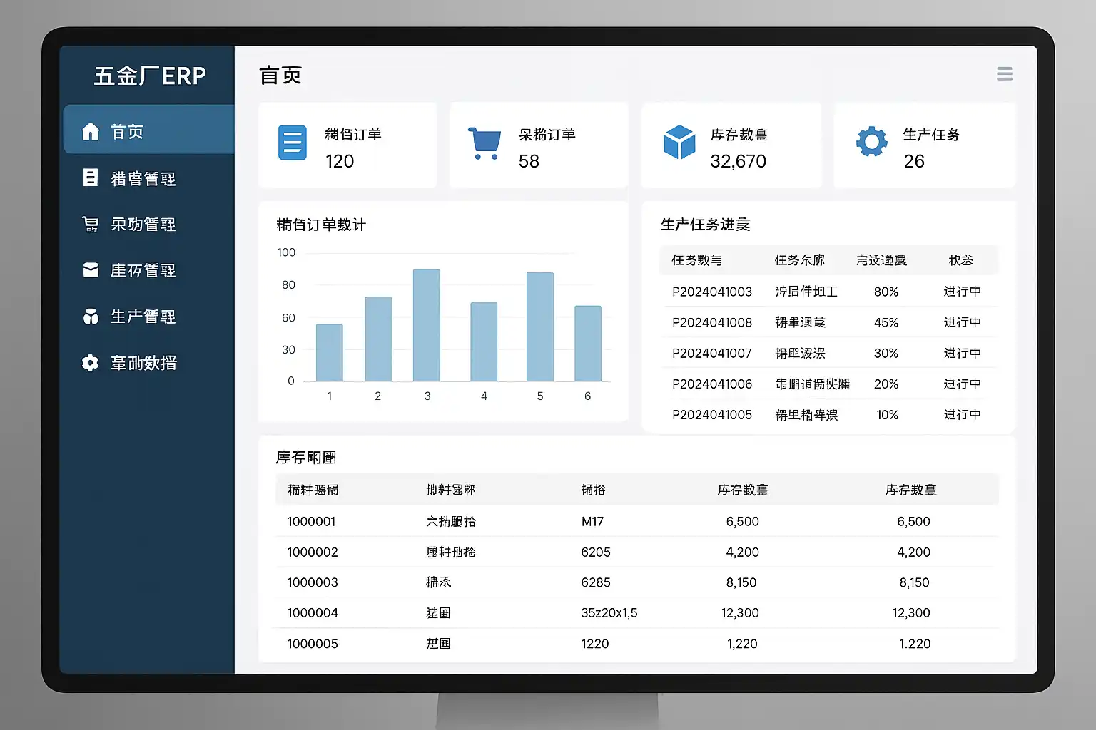 五金行业面临订单多样、原材料复杂、工艺流程繁琐等难题。针对这些痛点,现代ERP系统应具备如下主要功能:
