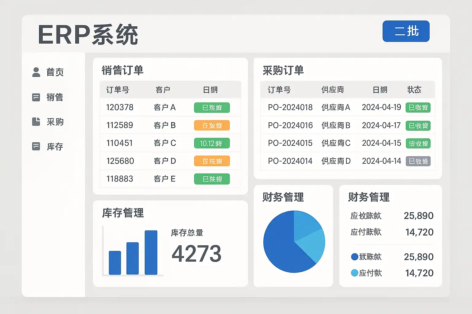 总结来看,“erp二批”不仅是简单的软件扩容,更是一次深刻的组织数字化蜕变。只有做好需求把握、强化团队培训、不停迭代升级才能真正让信息技术驱动企业精细运营。如果你想参考成熟模板、高效快速落地,可以关注我们公司正在使用的【简道云ERP系统】,其支持高度自定义,并适用于各类中大型企业场景。欢迎自取模板:https://s.fanruan.com/2r29p
