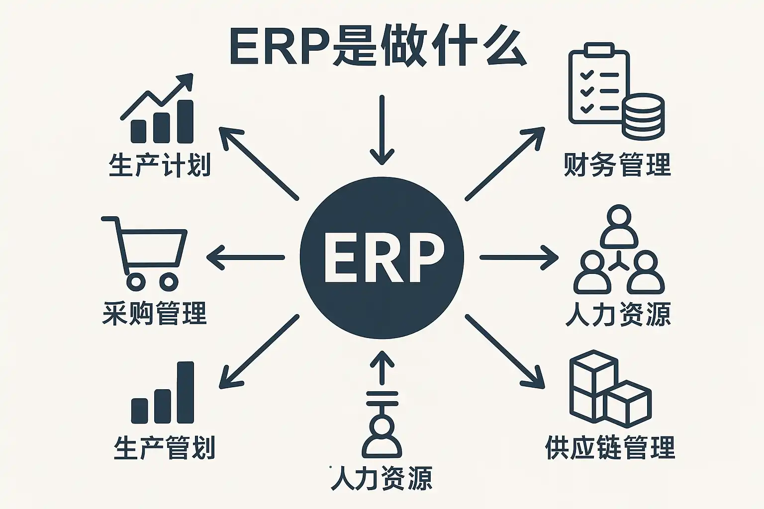 ERP(Enterprise Resource Planning,企业资源计划)是一套用于将企业各类基础资源(如人力、资金、物料、信息等)进行集成管理的信息化系统。它通过统一的信息平台,将各部门流程打通,实现跨部门的数据共享与协同操作,从而优化整体业务流程。