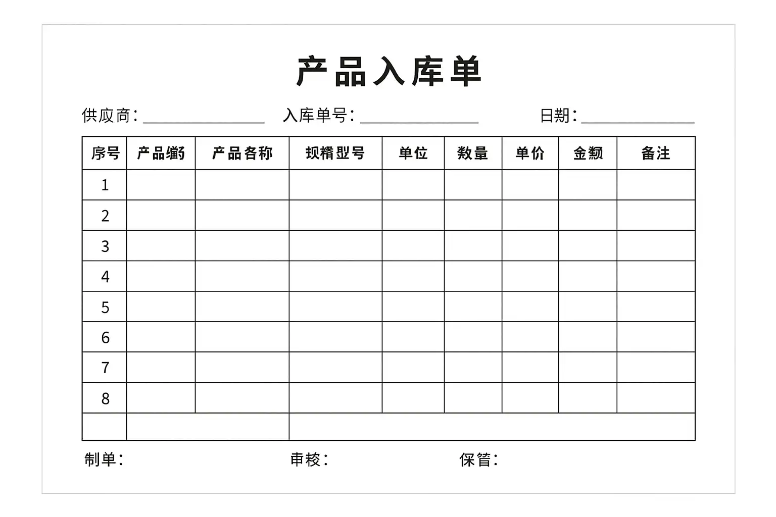 ERP(企业资源计划)系统中的产品入库单,是指企业在收到货物或自产成品需要入仓时,由相关人员在系统内填写并提交的一种业务单据。它详细记录了每批次产品的到货信息,包括:物品名称、编号、规格型号、数量、单位价、供应商信息以及验收人等内容。