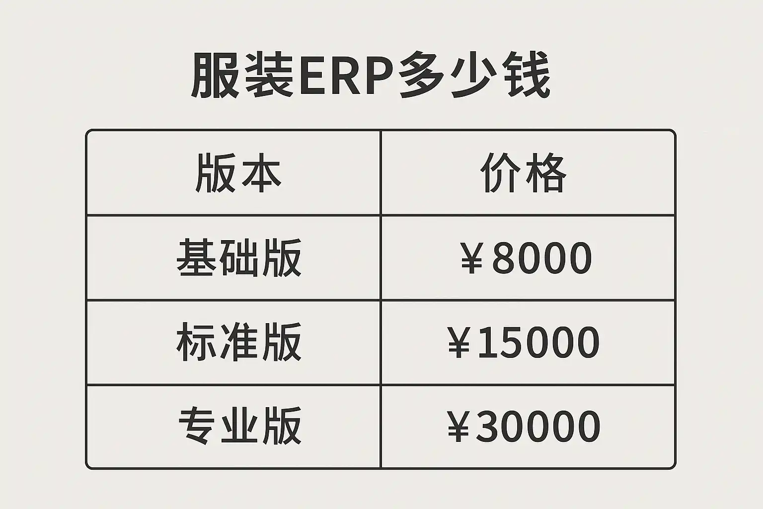 服装ERP系统的价格通常包含软件授权费、实施费用、培训费和维护费。根据市场调研,基础版服装ERP价格一般在3万到10万元人民币之间,高级定制版可达50万元以上。具体费用构成如下: