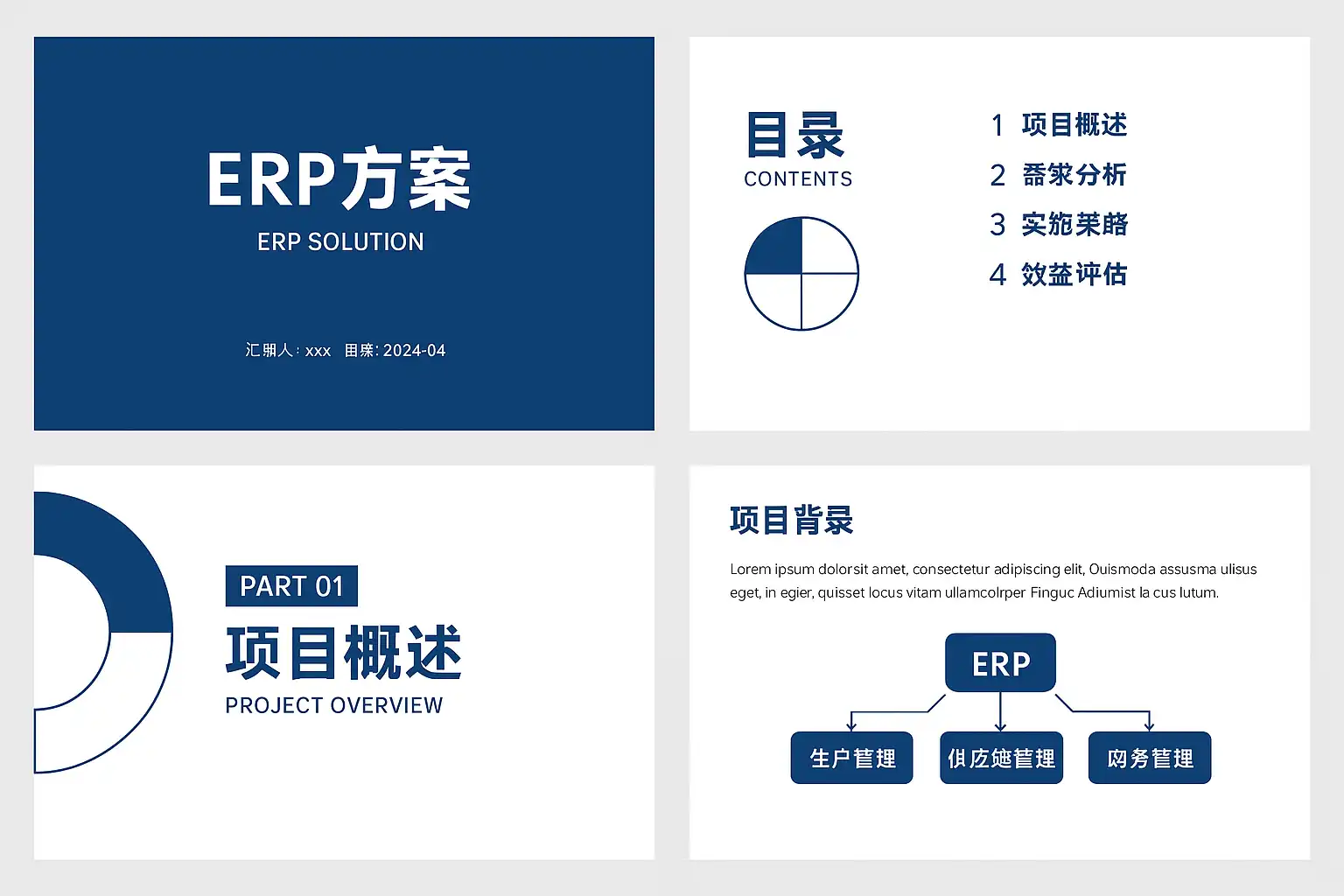 一份标准且具有说服力的ERP方案PPT通常包含以下几个板块: