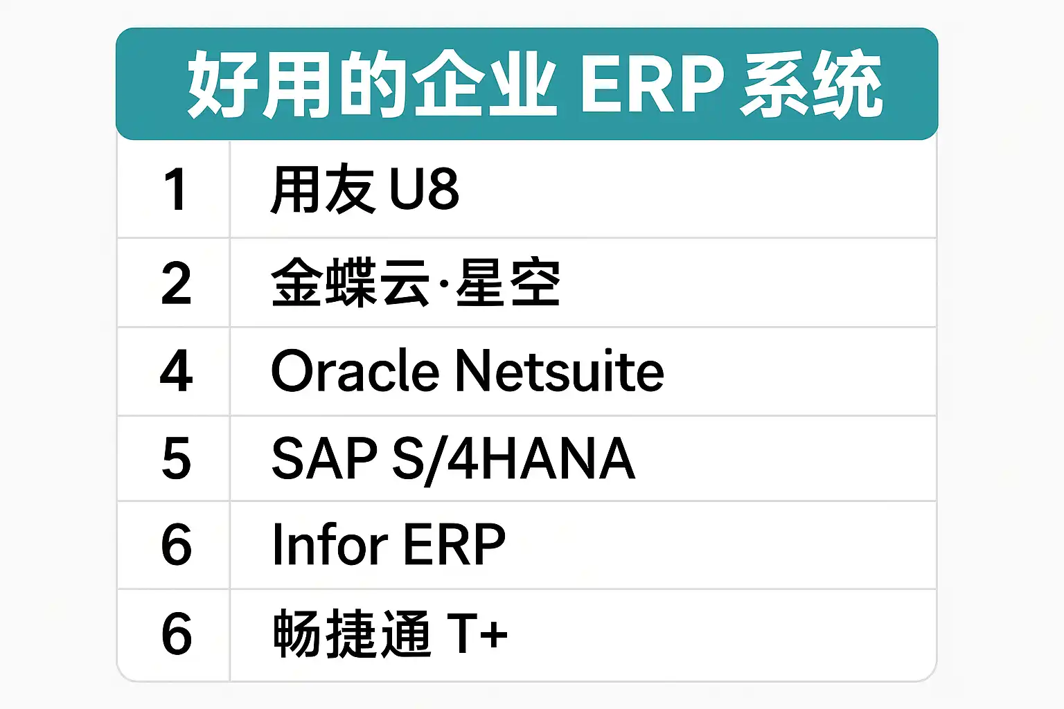 - 推荐:SAP S/4HANA, Oracle Fusion Cloud ERP