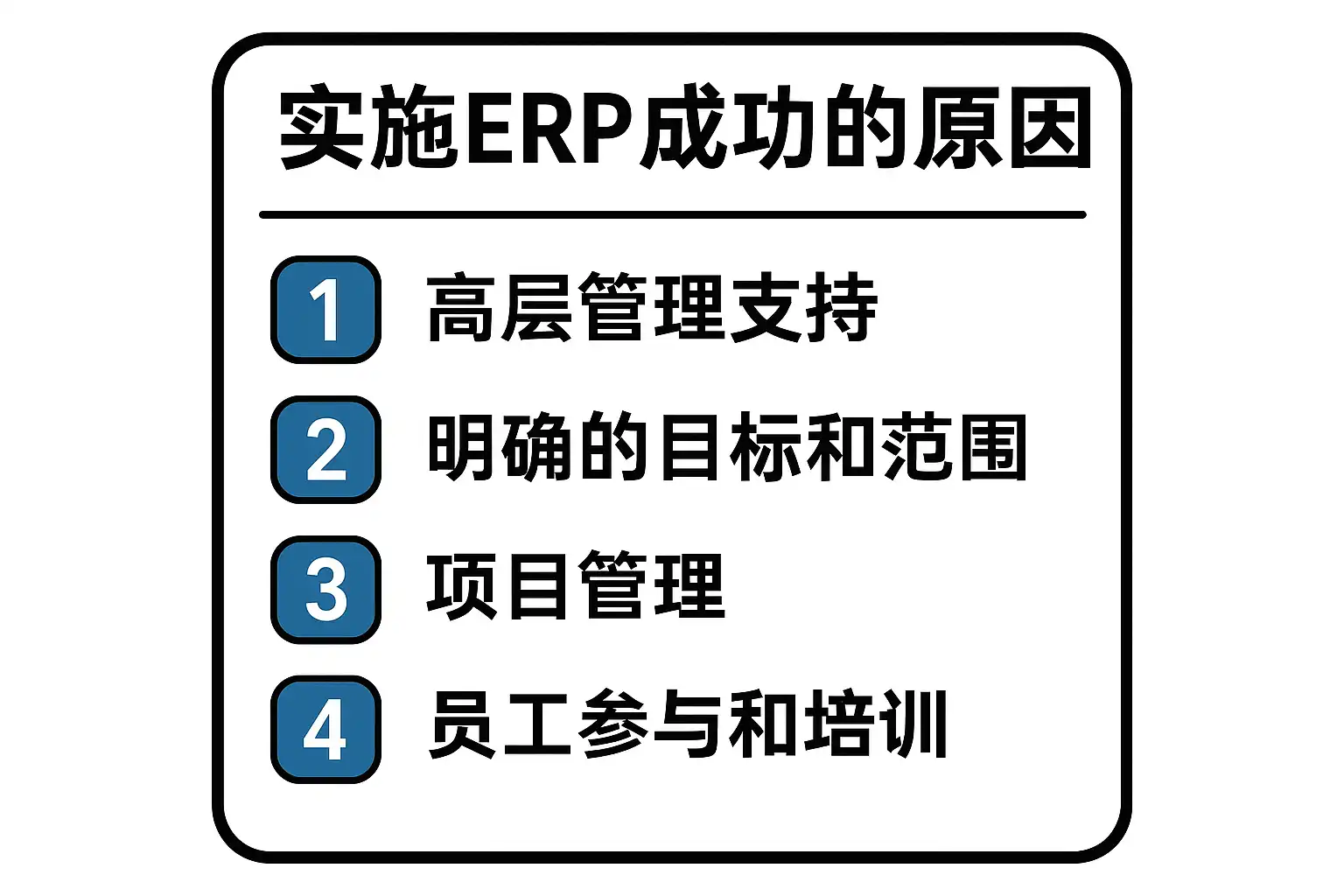 - 明确的项目目标和范围:确保ERP项目目标清晰,避免范围蔓延。