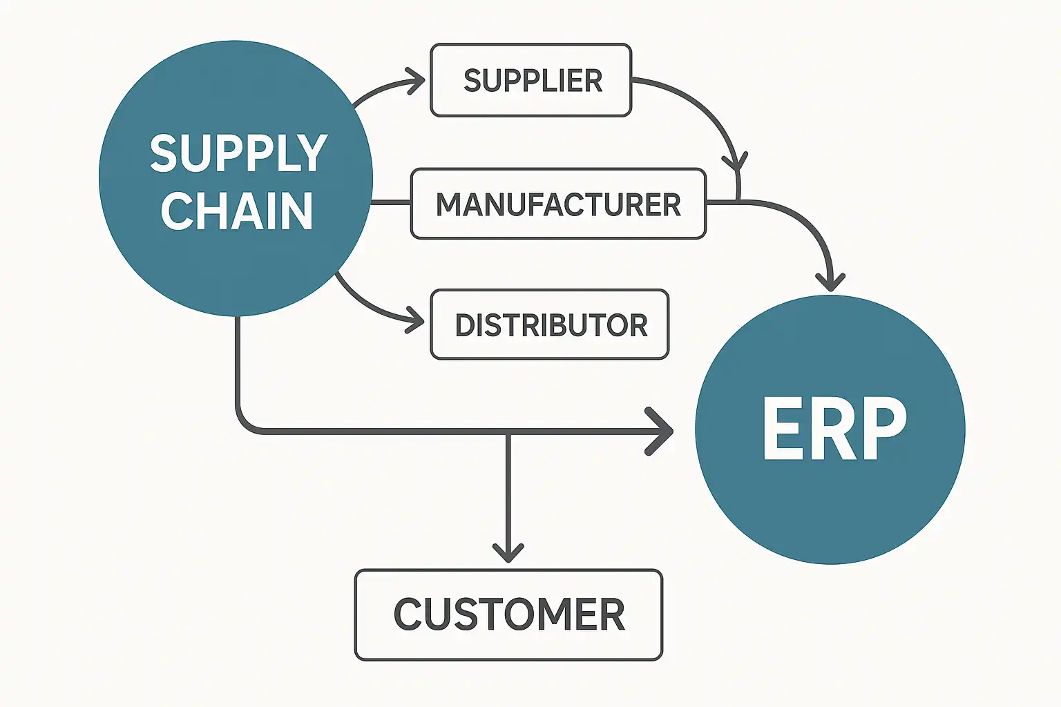 我在学习企业管理时,看到供应链管理和ERP系统常被一起提及,但不太明白它们具体有什么联系?它们是互相独立的,还是一个包含另一个?