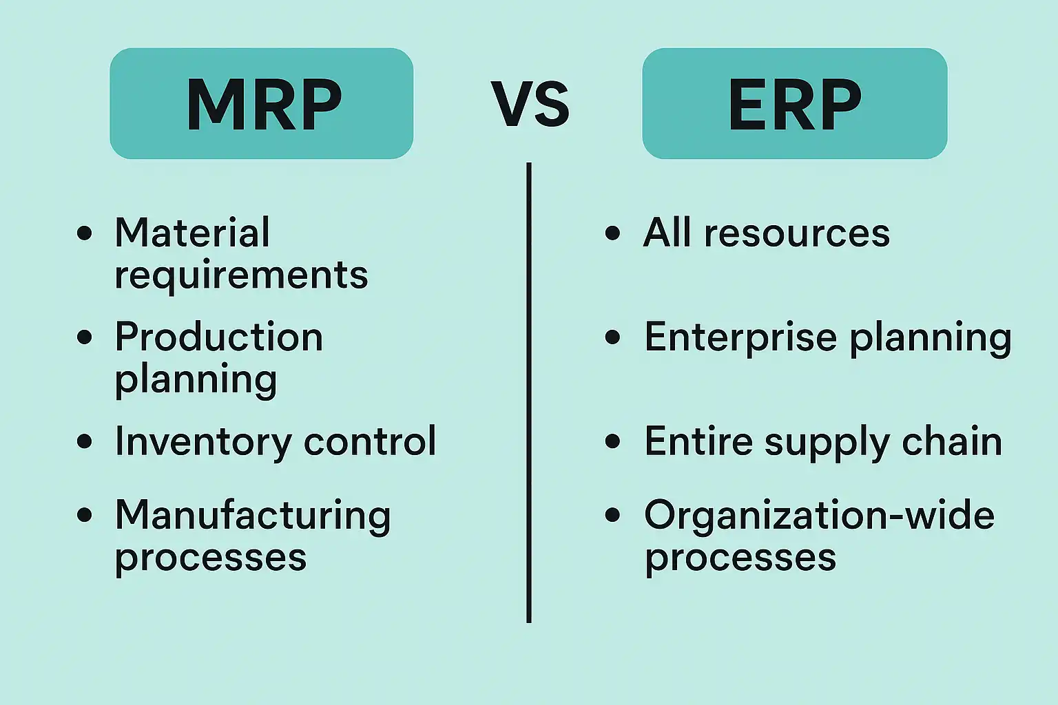 | 功能核心 | 物料采购与库存、生产计划 | 包含 MRP + 财务、人事、销售等 |