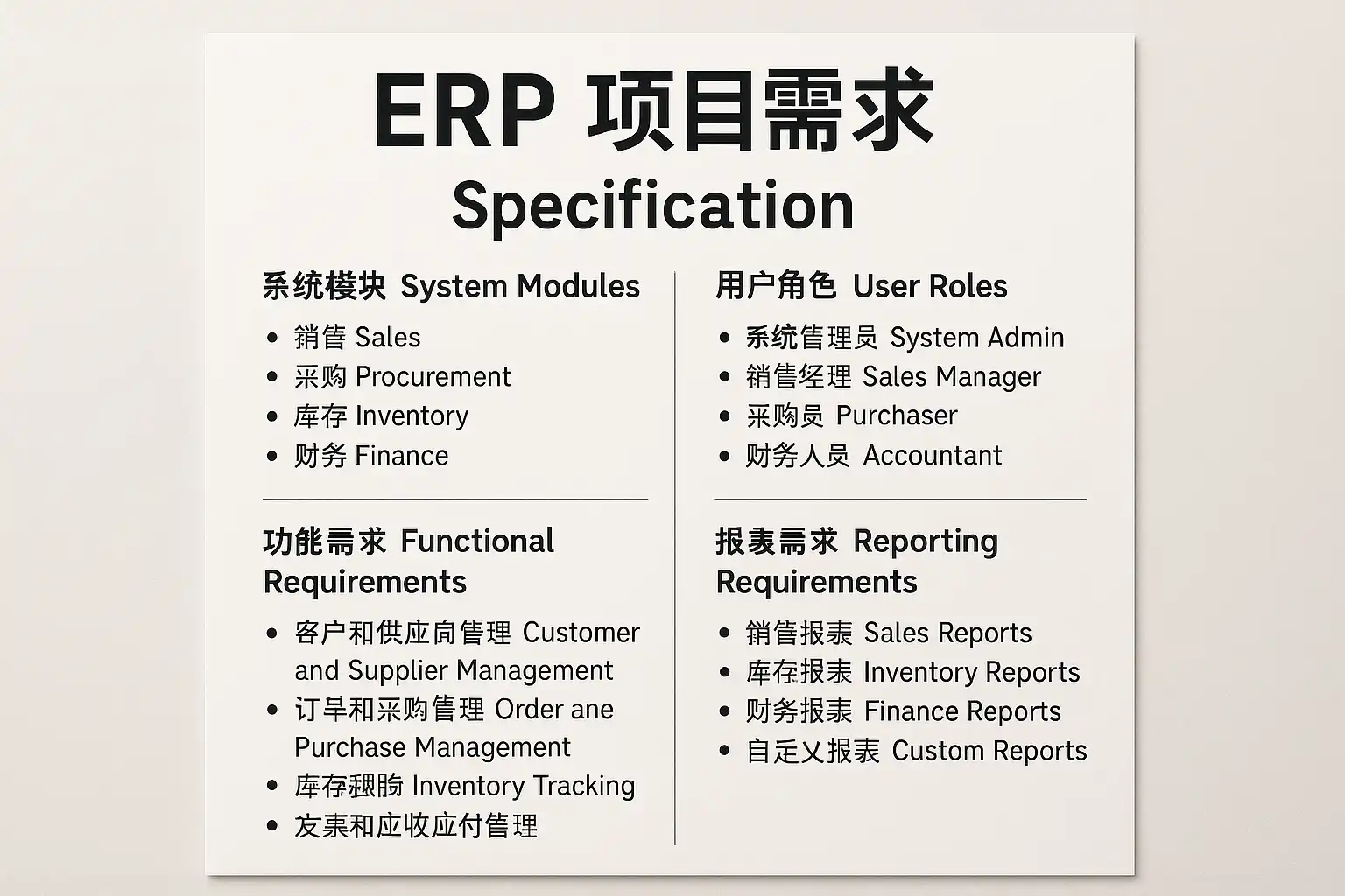 - 覆盖范围:采购、销售、人力资源、财务管理、库存控制等核心模块,以及相关接口对接、安全性等扩展要求。