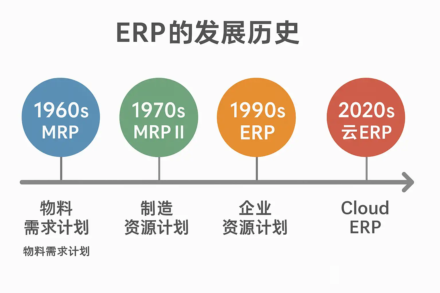 - 1960-1970年代:物料需求计划(MRP)系统出现,主要用于库存和生产管理。