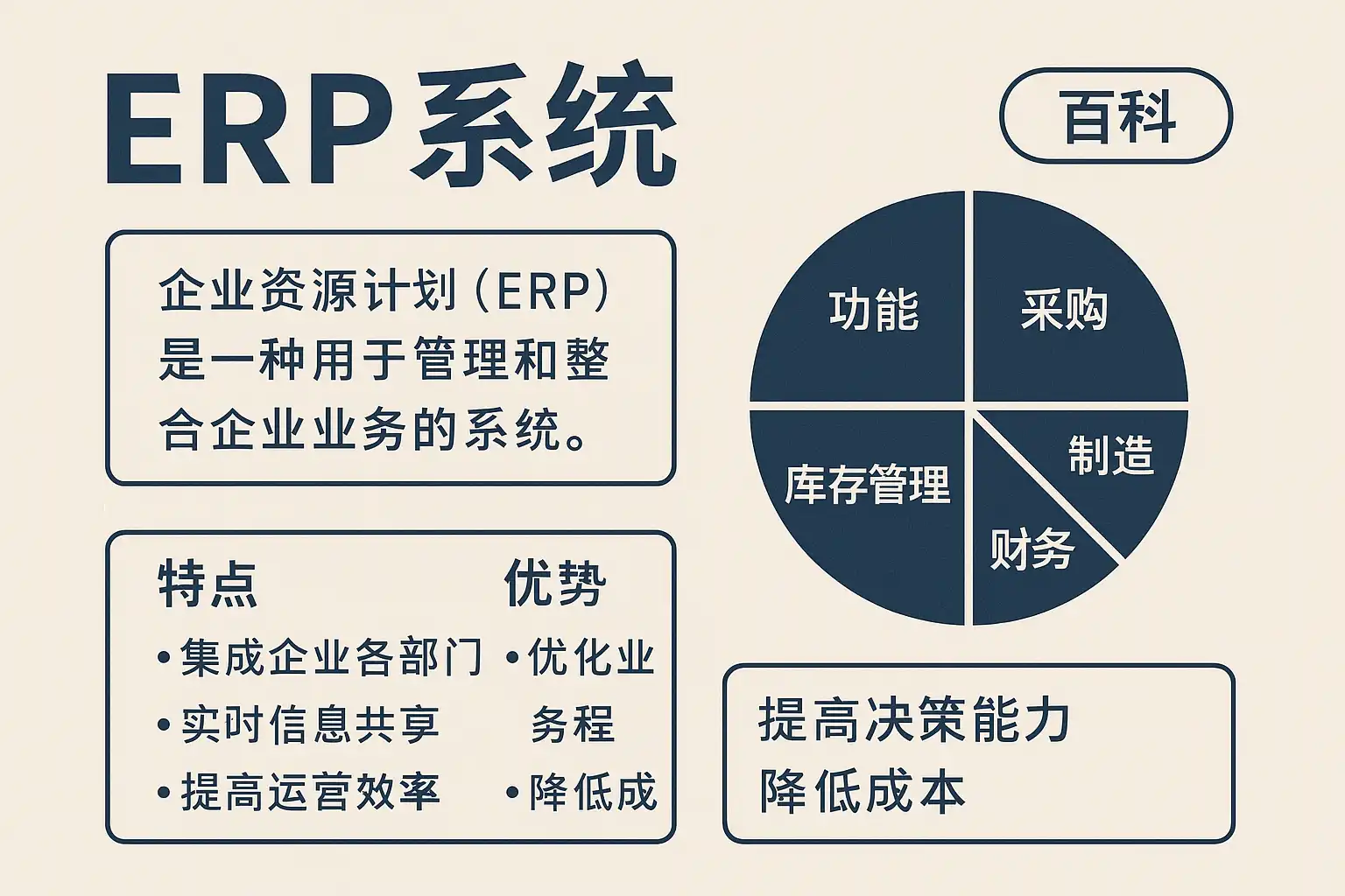 ERP系统(Enterprise Resource Planning,企业资源计划)是一种集成管理软件,帮助企业整合财务、供应链、生产、人力资源等多个业务模块。核心功能包括: