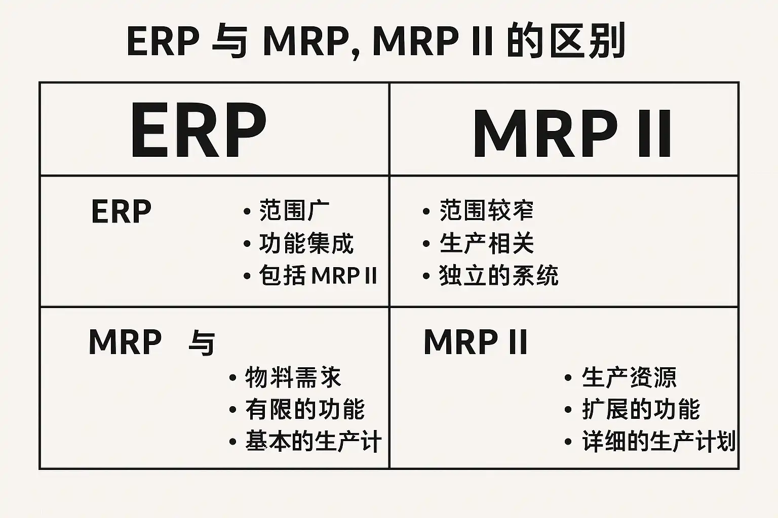 我经常听到ERP、MRP和MRP II这几个术语,但它们具体有什么区别呢?作为初学者,我想了解它们在功能和应用上的差异,方便我选择合适的系统。