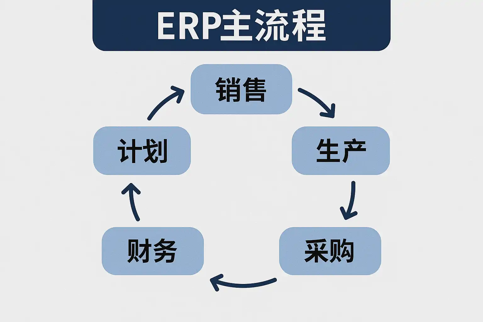 ERP主流程通常涵盖采购管理、库存管理、生产计划、销售管理和财务管理五大核心模块。具体包括: