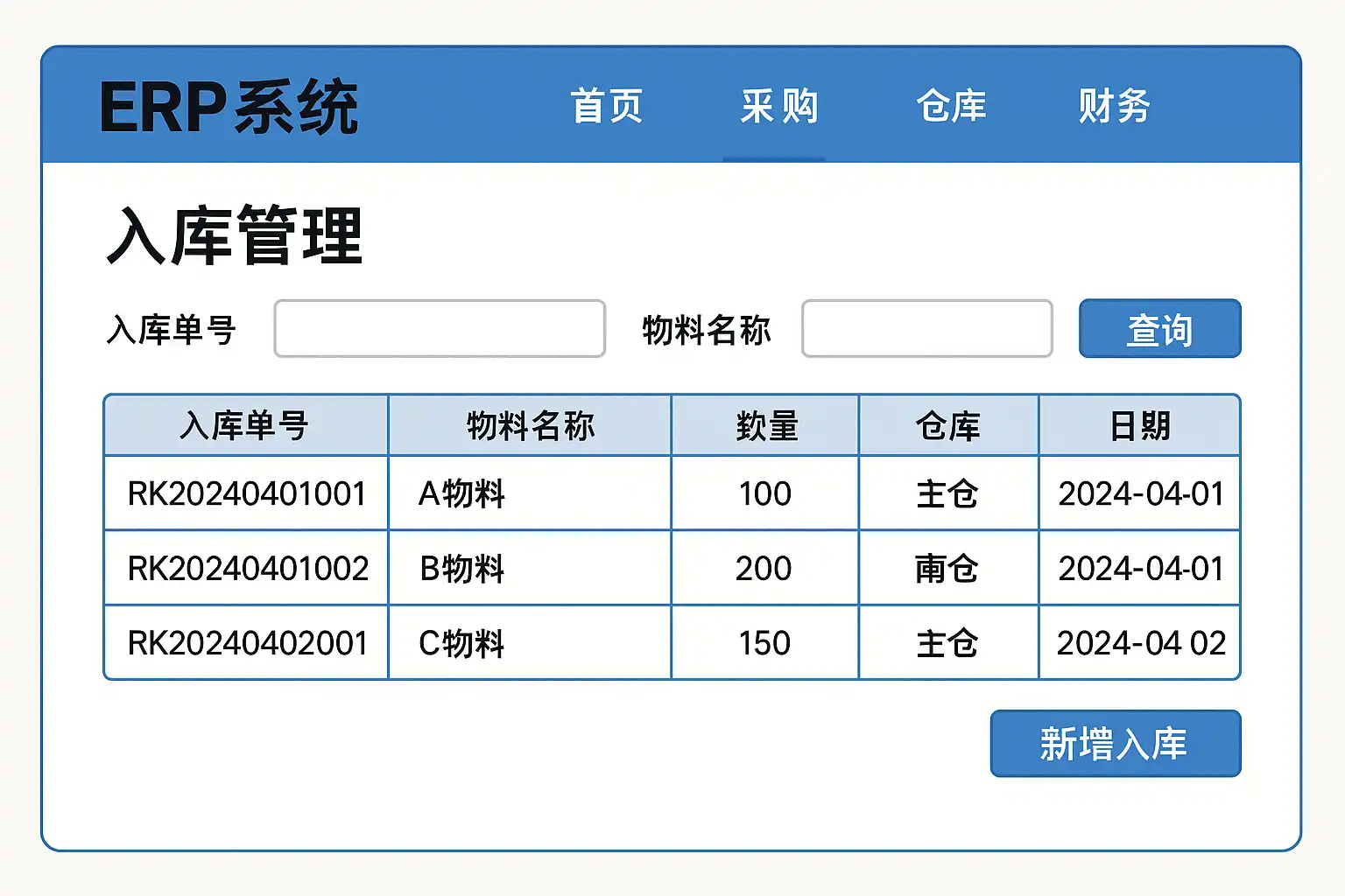 - 入库单录入:在ERP系统中录入入库单据,完成库存更新。