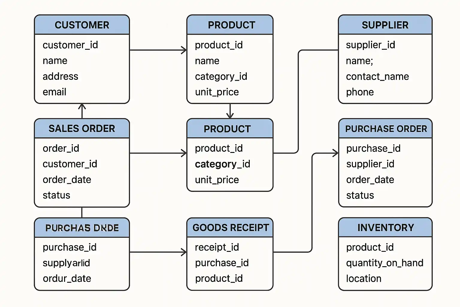 | 销售管理 | 客户表、销售订单表、出库单表 | 管理销售和发货流程 |