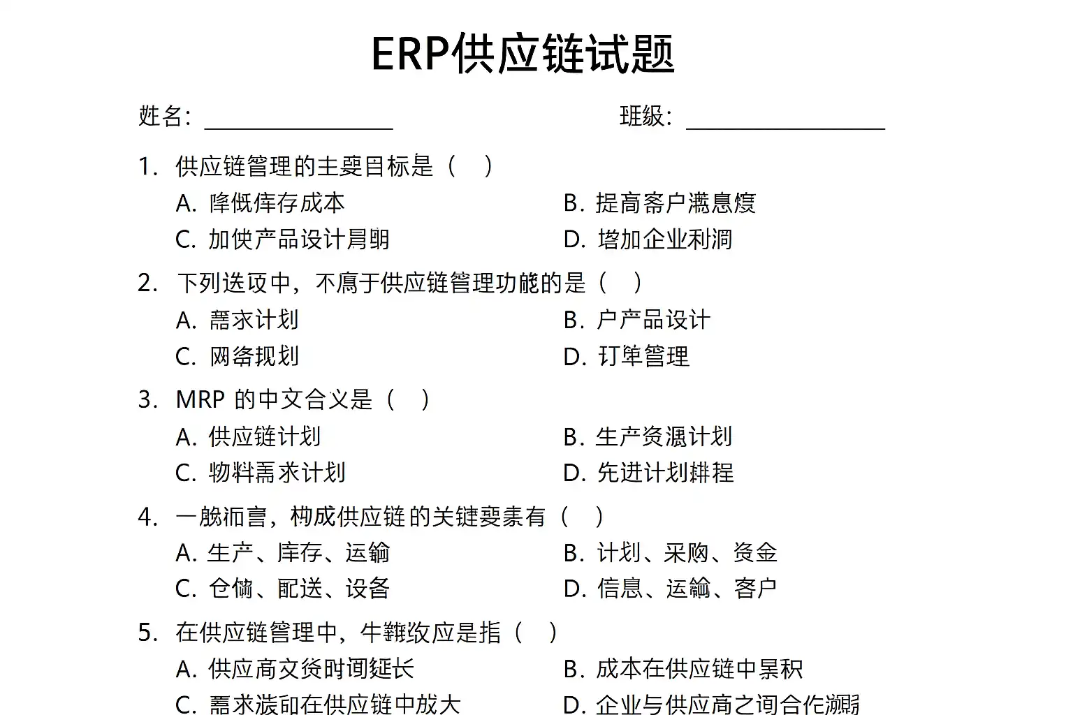 ERP(企业资源计划)在供应链管理中的应用广泛,试题设计通常围绕以下几个主要模块展开:
