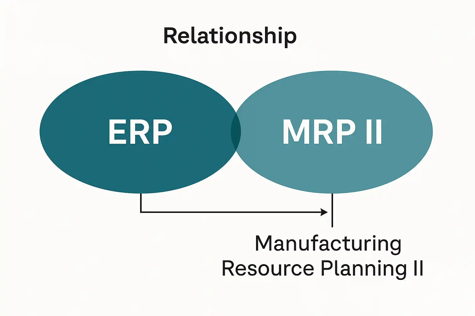 我在学习企业资源计划系统时,经常听到ERP和MRP II这两个概念,但它们之间具体有什么联系和区别呢?能否帮我理清这两者的关系?