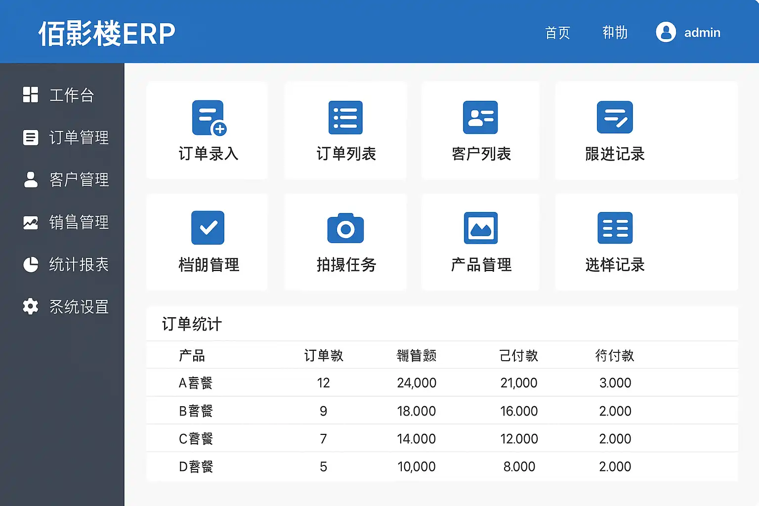 佰影楼ERP是专为摄影行业定制的信息化平台,它围绕客户生命周期管理、订单处理、库存及财务等环节,实现业务流程数字化和高效协同。以下为主要功能模块: