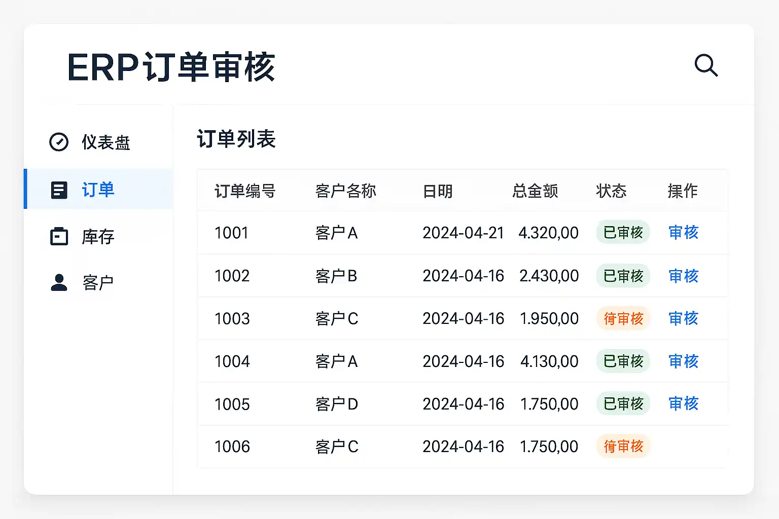 ERP(Enterprise Resource Planning)系统中的订单审核,是指对销售或采购等业务环节中的客户订单进行合规性检查和审批确认的过程。它通常包括内容核对(如商品、数量、价格)、信用评估、合同/资质确认以及审批流转等环节。