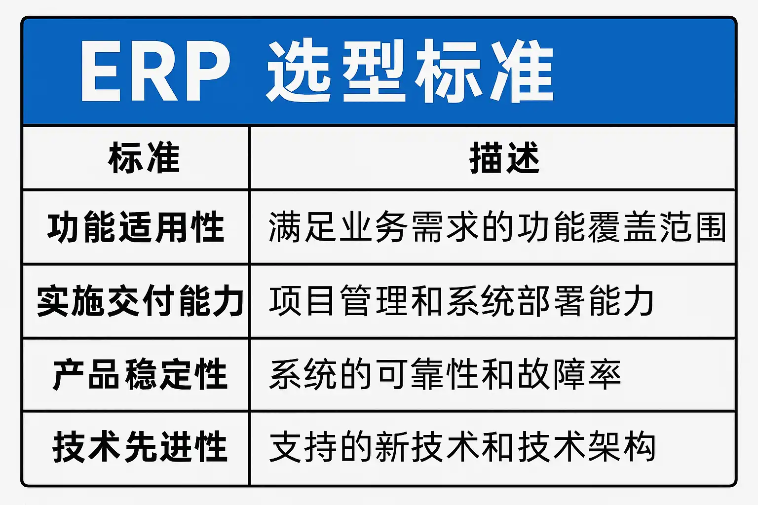 选择ERP系统时,重点关注的ERP选型标准包括以下几个关键指标: