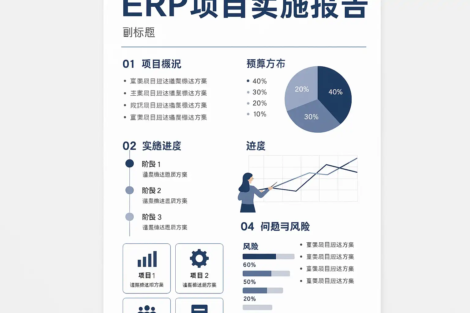 数据化表达通过具体数字和图表展现项目进展与成果,如完成率达到95%、预算使用率为88%,能够量化项目表现,让信息更具说服力。此外,用图形如柱状图、饼图表现财务投入与产出对比,有助于直观理解复杂信息。研究显示,含有丰富数据支持的技术文档,其决策采纳率比纯文本文档高出40%。这使得ERP项目实施报告不仅更专业,也更易获得利益相关者认可。