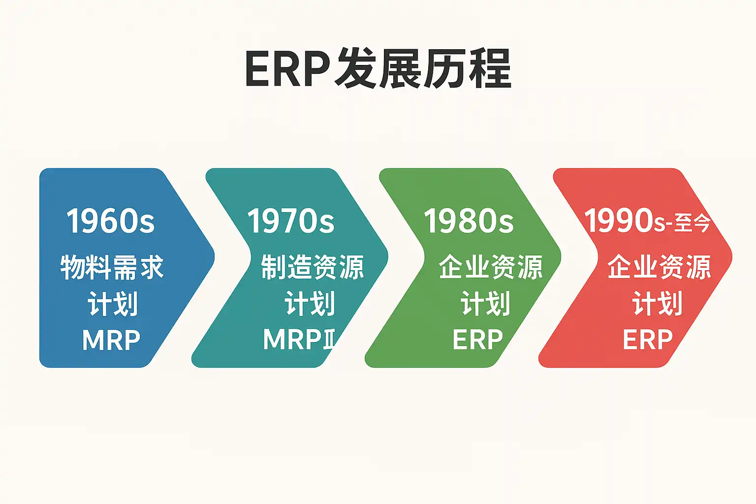 | MRP | 1960s-1970s | 聚焦物料库存与采购管理 | 支持生产计划,降低库存成本 |