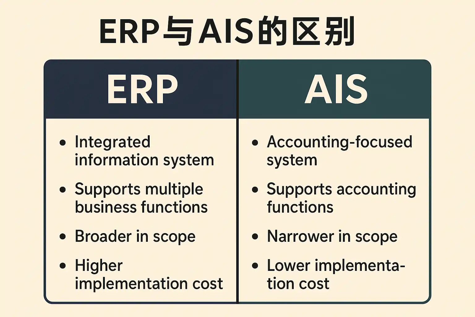 | 项目 | ERP(企业资源计划) | AIS(会计信息系统) |