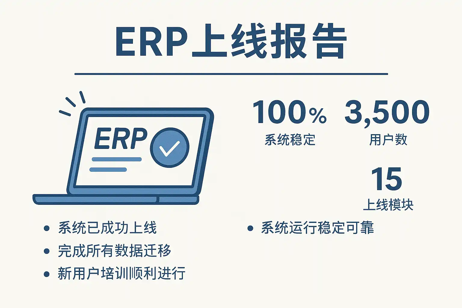 ERP上线报告通常包括:项目背景与目标、实施过程回顾、数据迁移与测试情况、用户培训及推广情况、遇到的问题及解决措施、新旧系统切换方案,以及后续运维支持计划等。以下为核心结构: