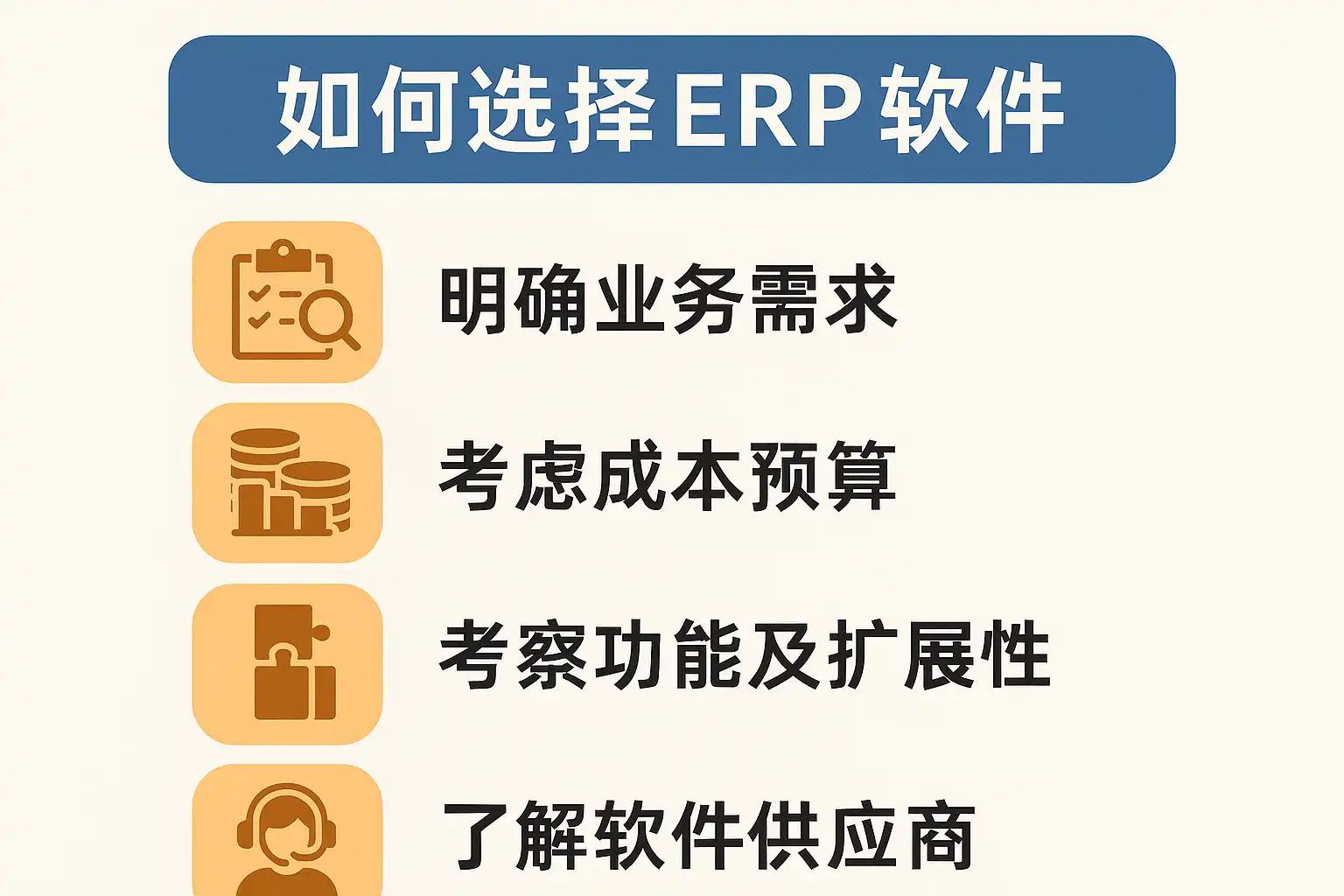 综上所述,要科学选择适合自身发展的ERP软件,应严格遵循以下行动步骤: