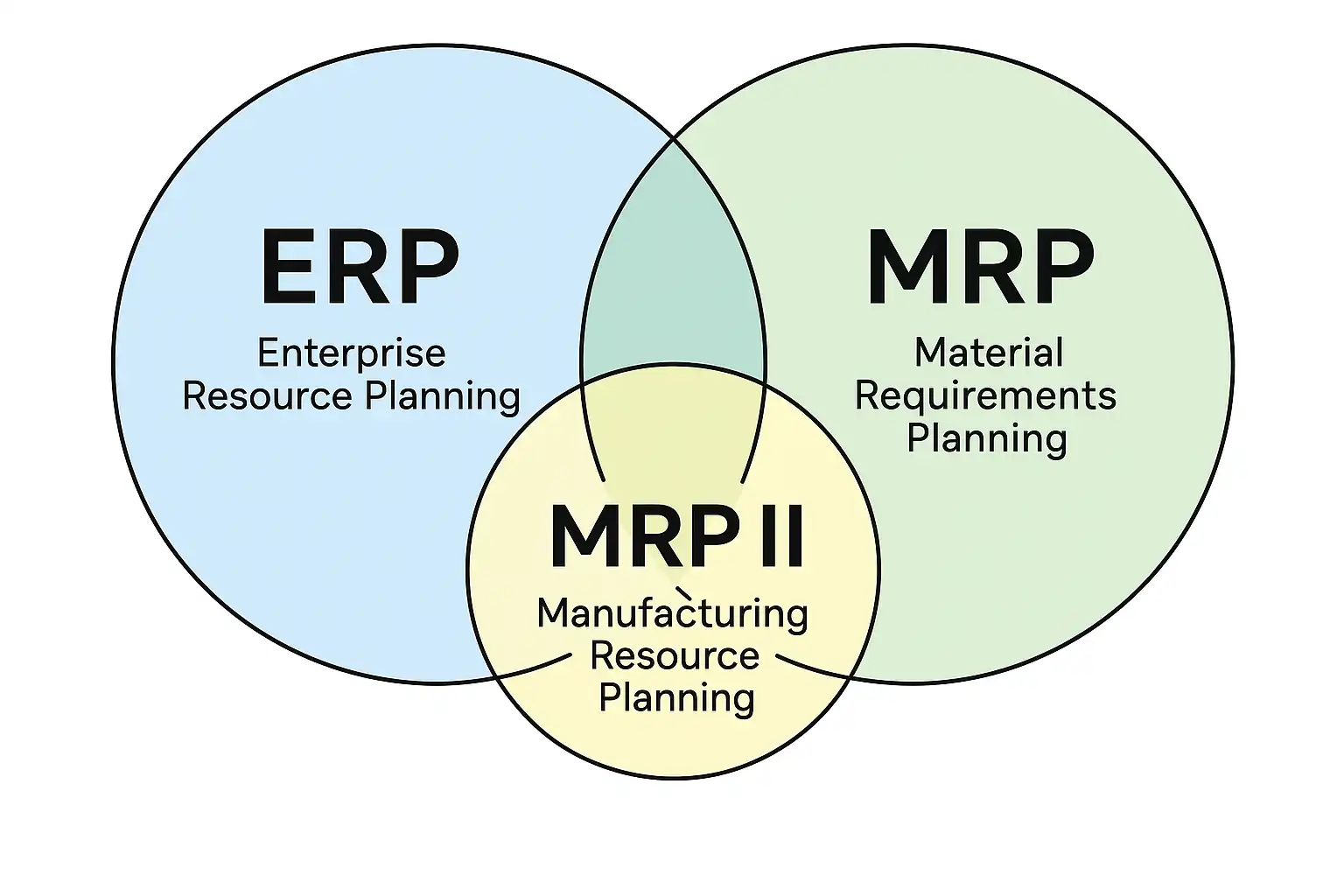 | MRPII | Manufacturing Resource Planning | 扩展至生产资源(设备、人力);生产计划与控制 | 采购、库存和生产 |