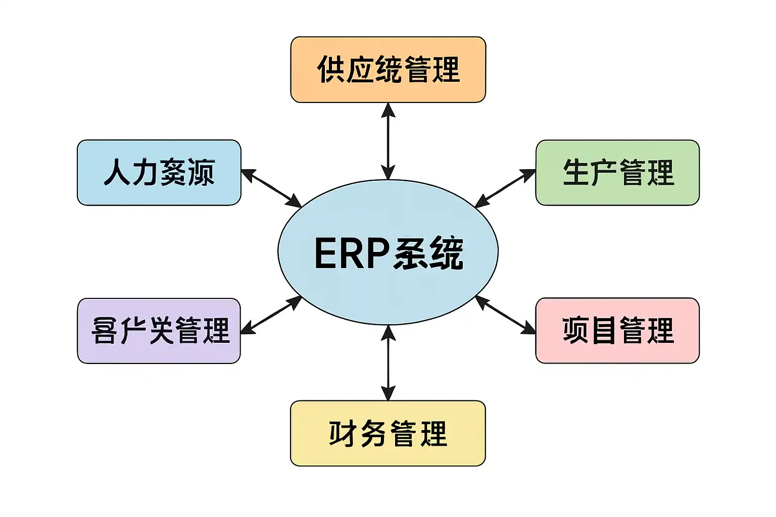 常见关键模块包括财务管理、采购管理、库存管理、生产制造和销售管理。这些模块通过业务流程链接形成闭环: