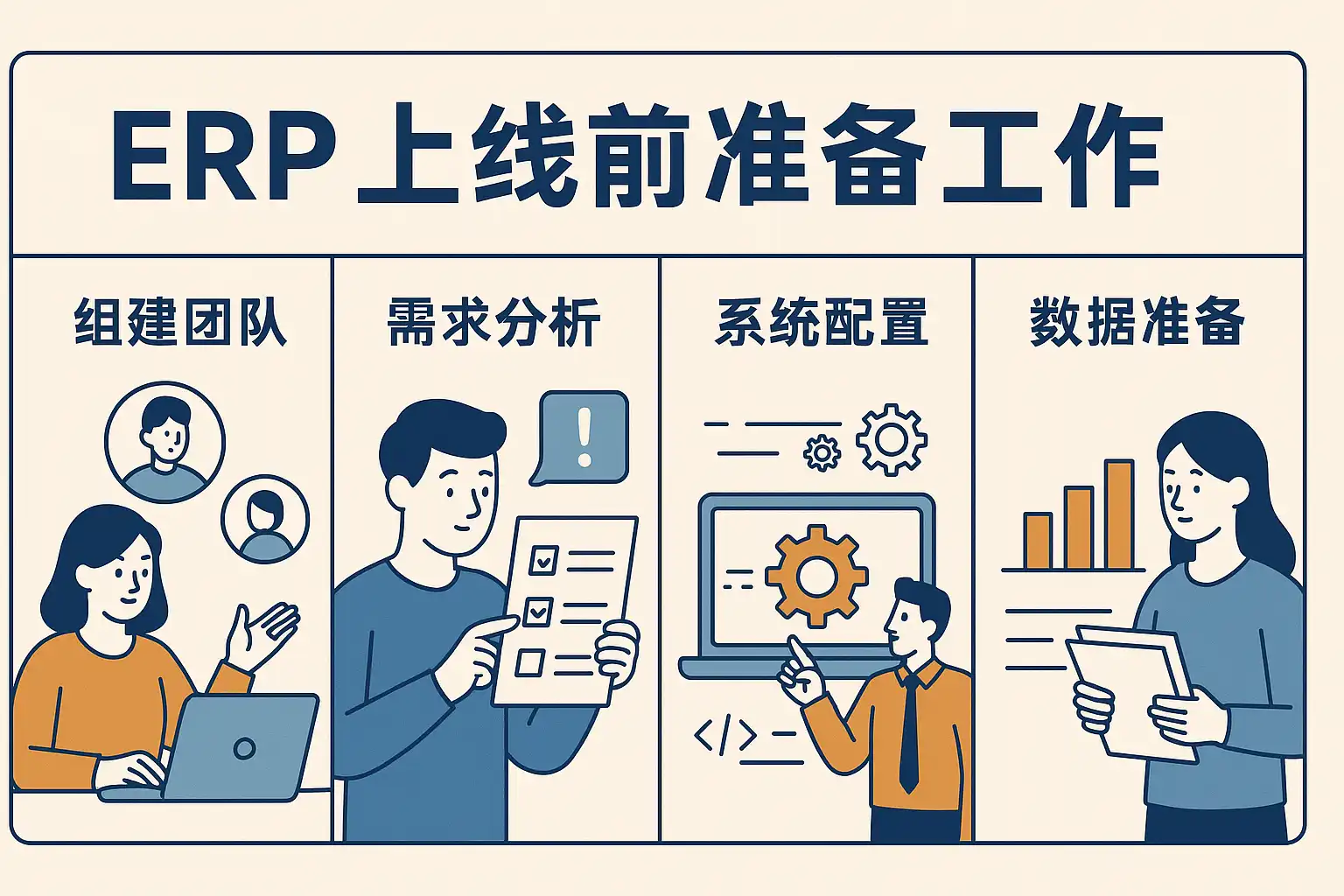 我即将启动ERP系统上线,但对上线前的准备工作不太清楚。具体有哪些关键步骤必须完成,才能保证上线顺利进行?