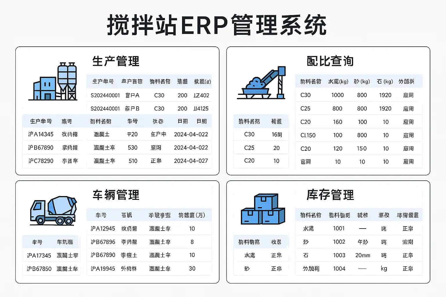 搅拌站ERP管理系统主要涵盖以下核心功能: