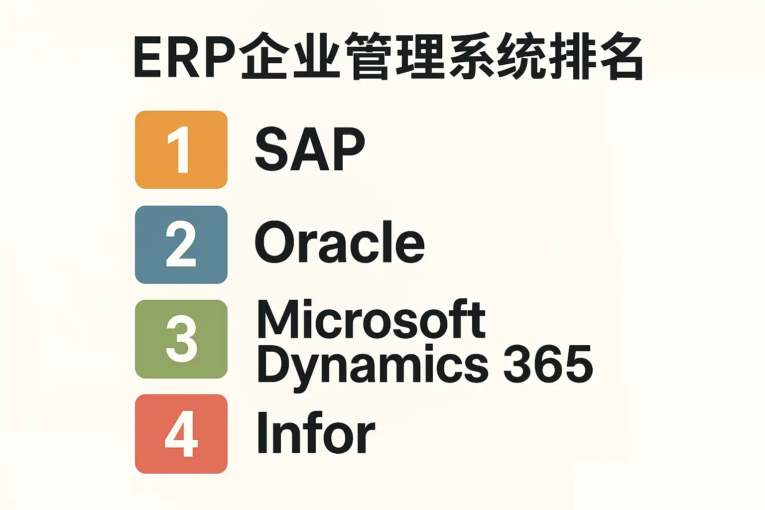 | 1 | SAP ERP | 全球/中国 | 中大型/跨国 | 功能强大, 行业方案多 |