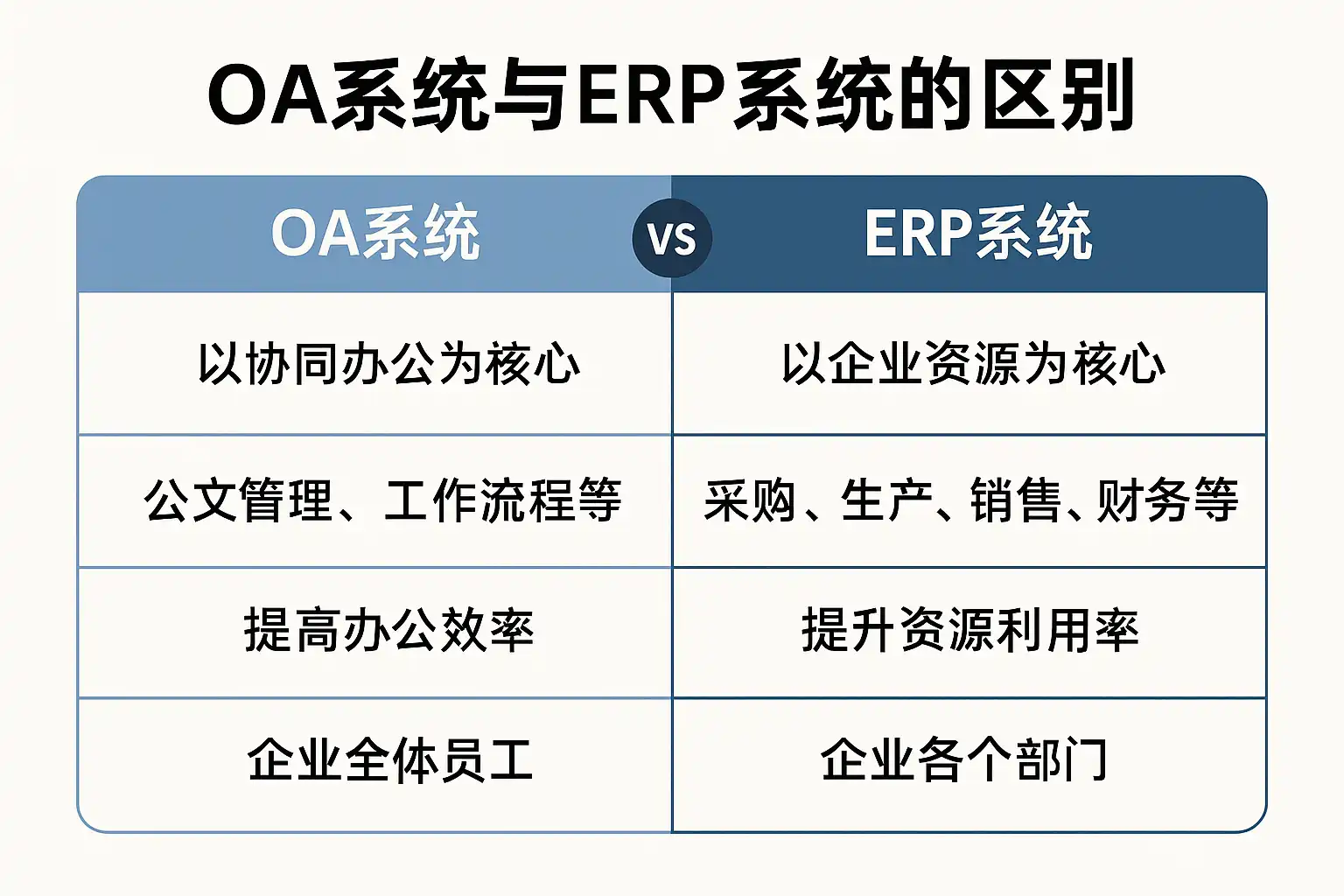 我经常听说OA系统和ERP系统,但它们具体有什么区别呢?我想了解这两者在功能和应用场景上的不同点,方便我选择适合公司的管理软件。