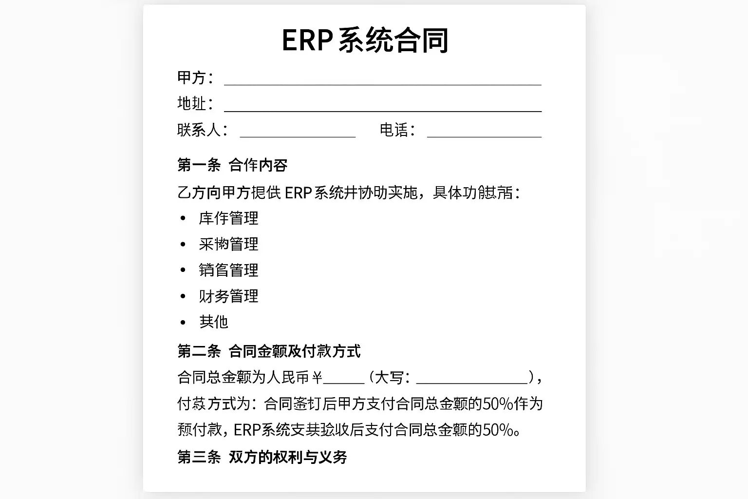 ERP(Enterprise Resource Planning,企业资源计划)系统是企业实现信息化管理的重要工具,而一份规范的ERP系统合同,是保障实施顺利推进、防范风险和明确权责的重要法律文件。下表列举了一个标准ERP系统合同应包含的主要条款: