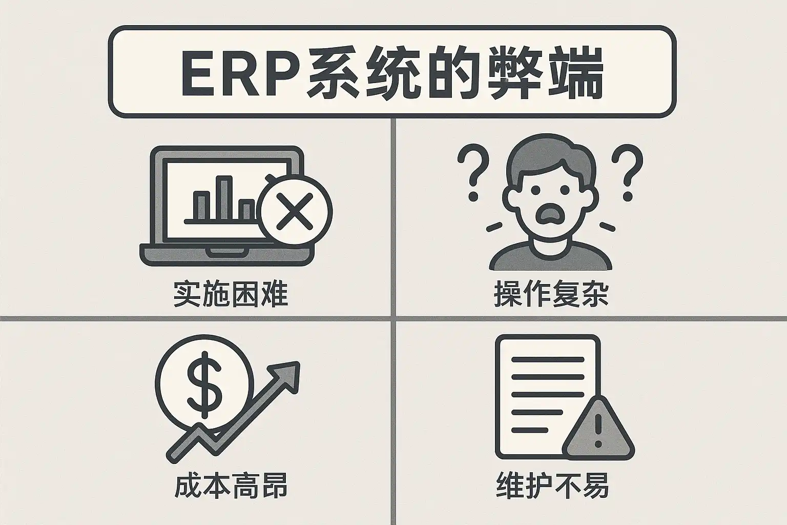 ERP系统虽然能提升企业管理效率,但也存在一些常见弊端: