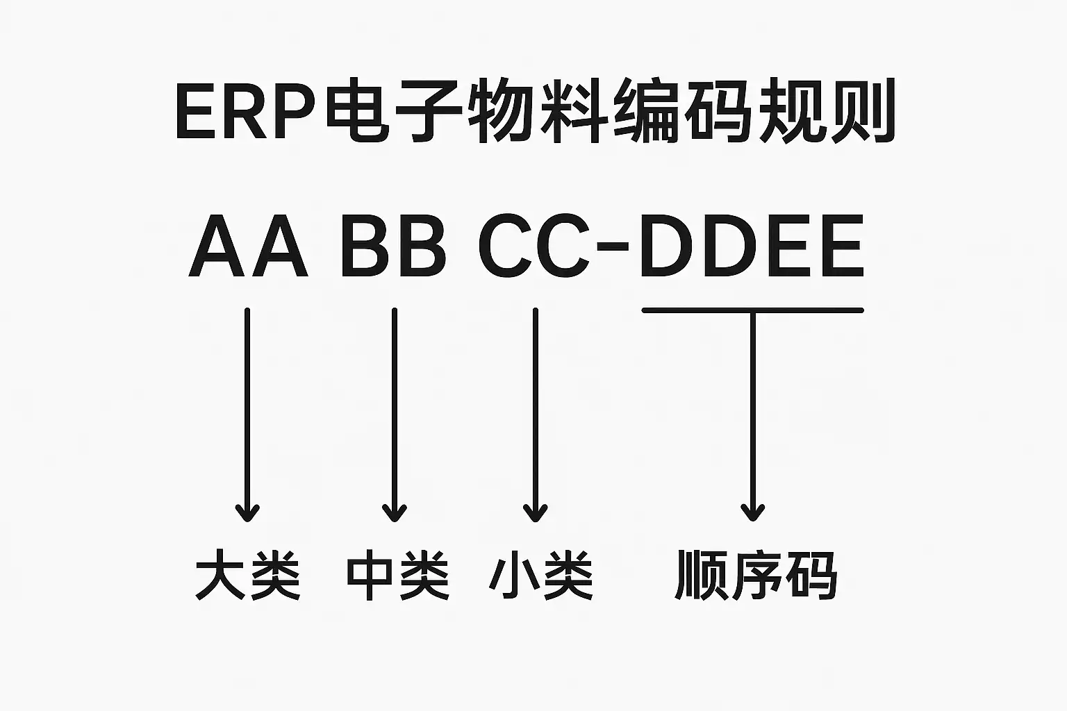 | 分段结构型(如:01-02-003) | 明确区分类别、规格等层次 | 编码较长,需要严格定义各字段含义 | 多品类/复杂产品结构 |