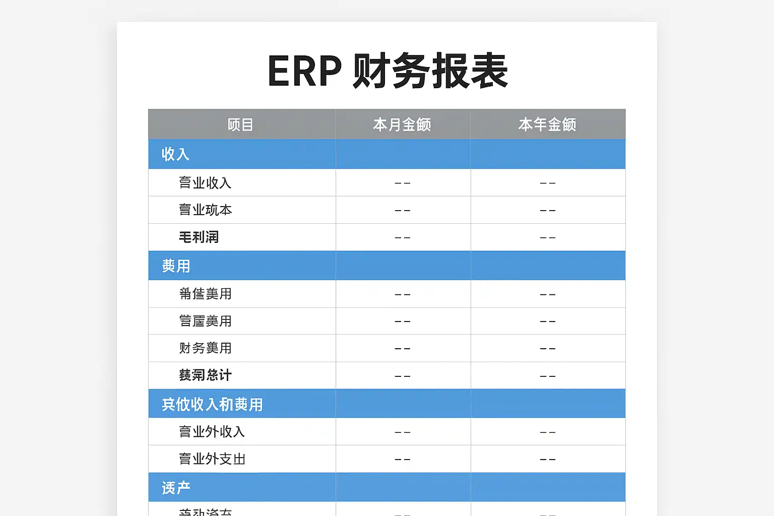 ERP(Enterprise Resource Planning,企业资源计划)系统中的财务报表模板,是指预设于系统内、可自动生成各类关键会计及管理报表的标准格式。其主要功能包括: