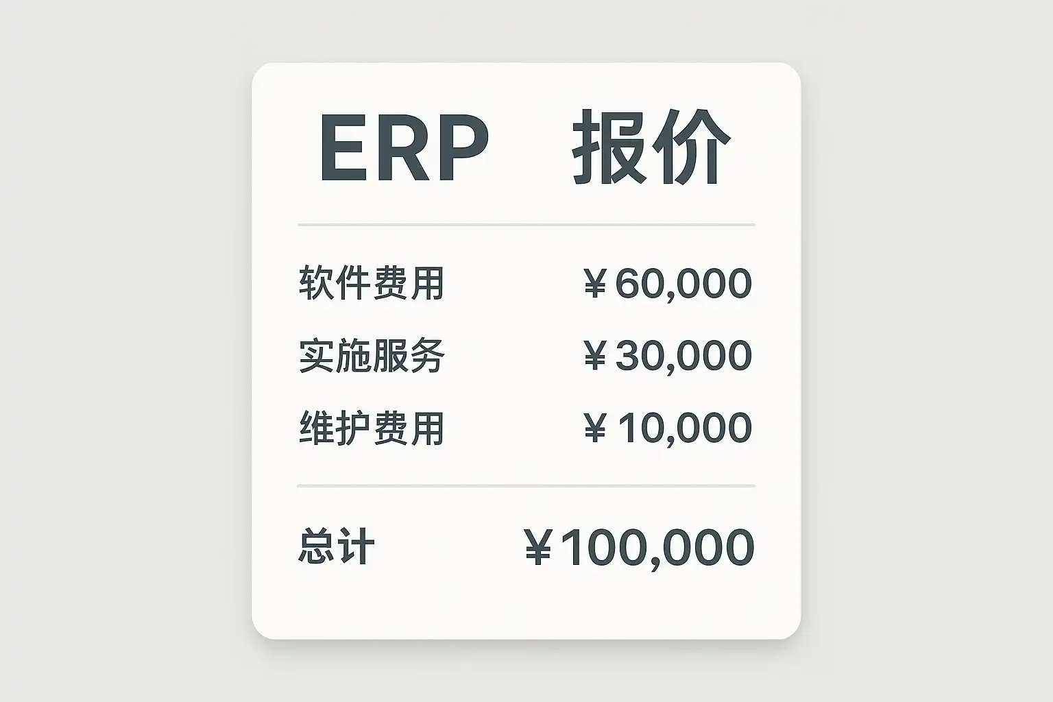 例如,一家制造企业的ERP报价中,软件许可占总价的40%,实施服务占35%,培训占15%,维护支持占10%。这种结构有助于企业全面评估投入成本。