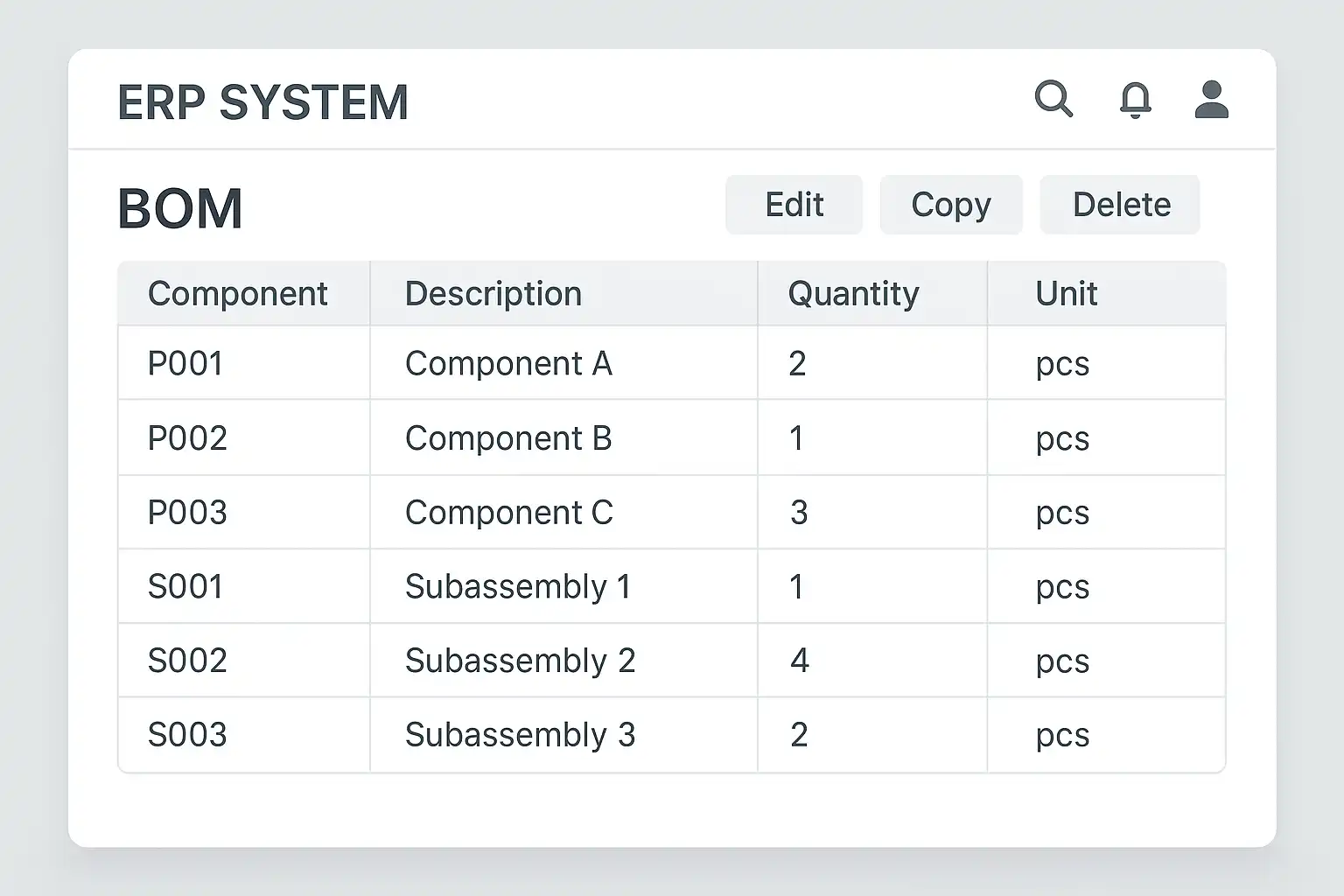 | 多级编辑 | 支持子件、半成品等多层次物料清单维护 |