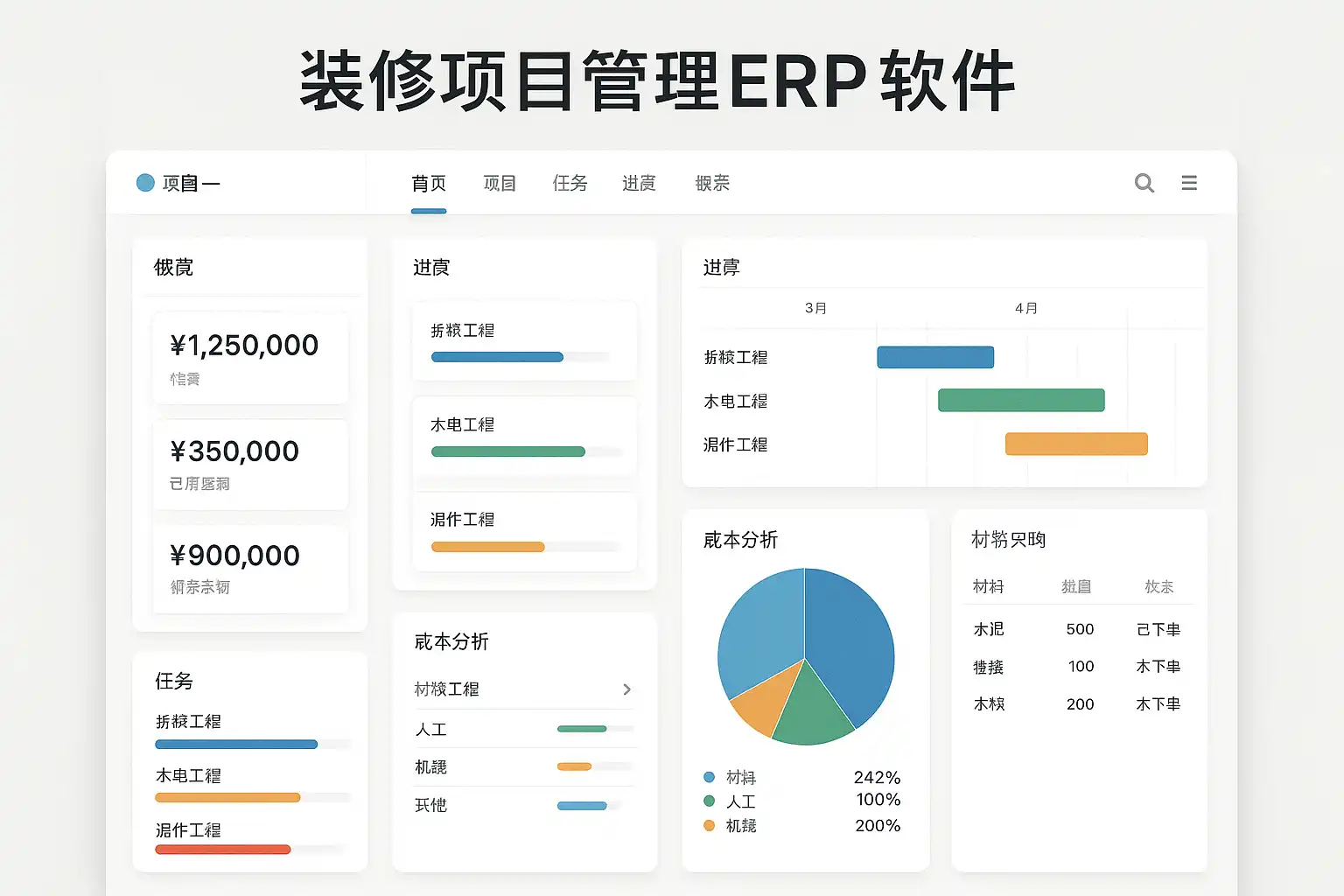 装修项目管理ERP(Enterprise Resource Planning)软件,是专门针对装饰行业开发的信息化平台。它集成了设计、预算、采购、合同、施工、人力资源、财务等多模块,旨在通过流程标准化和信息数字化,提高装修企业的运营效率与管控水平。