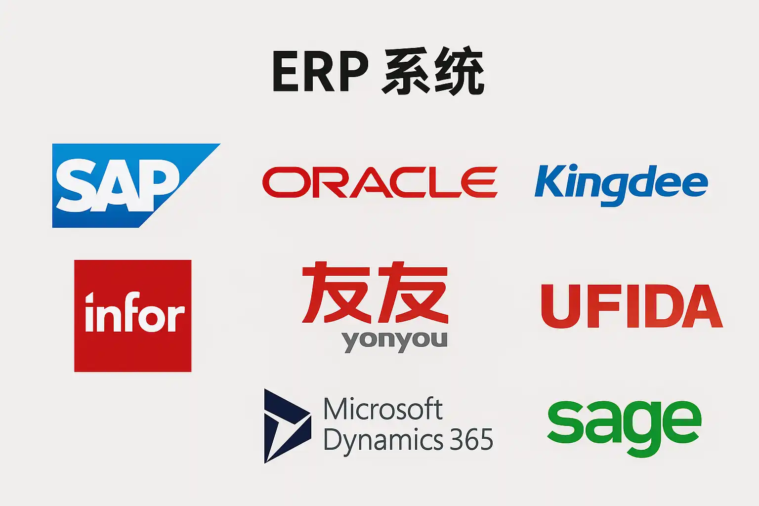 - 用友 —— 中国本土品牌,在制造业和服务业有广泛应用,支持多行业定制。