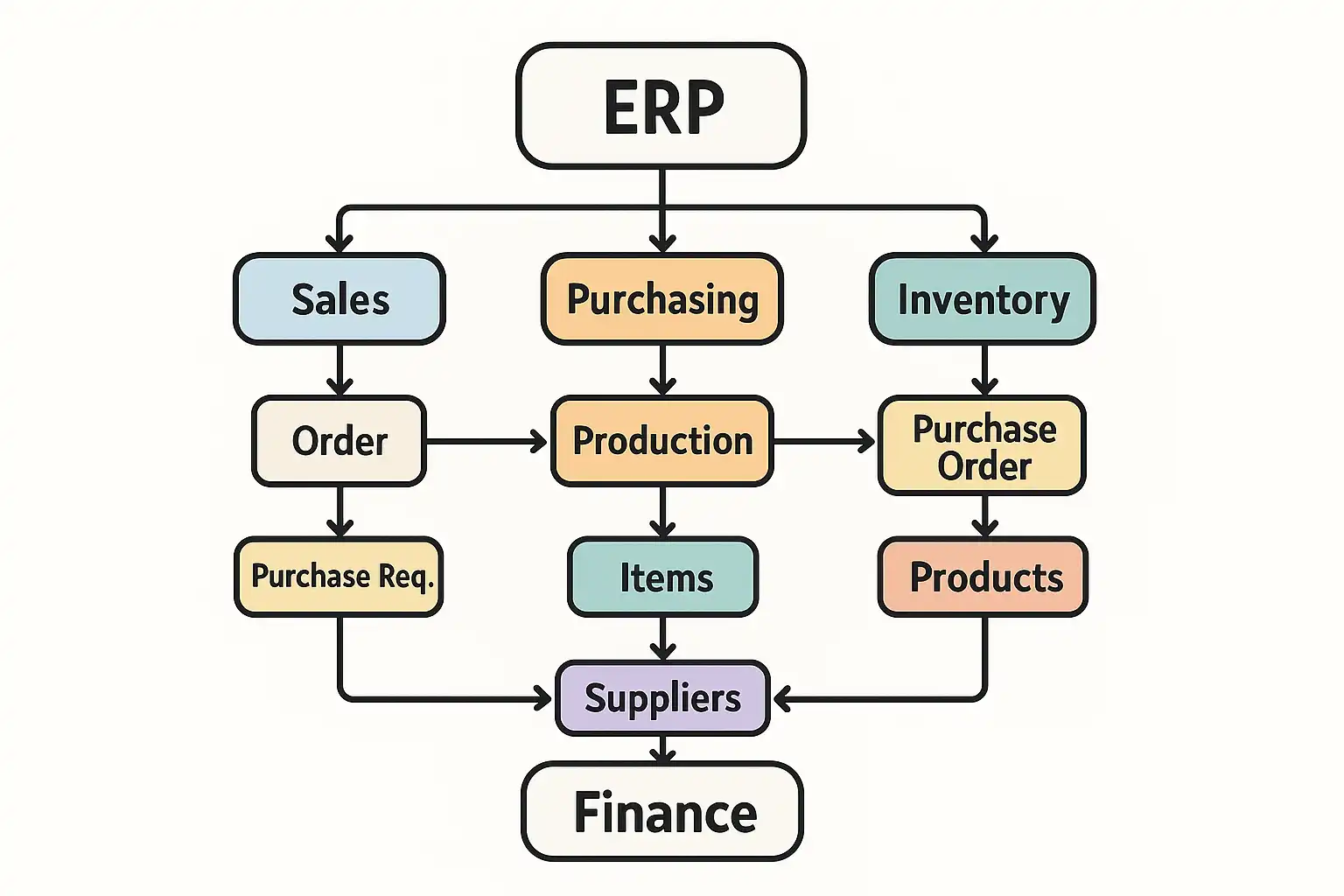 | 销售 | 客户订单处理,发货 | 关联库存(出库)、财务(应收) |