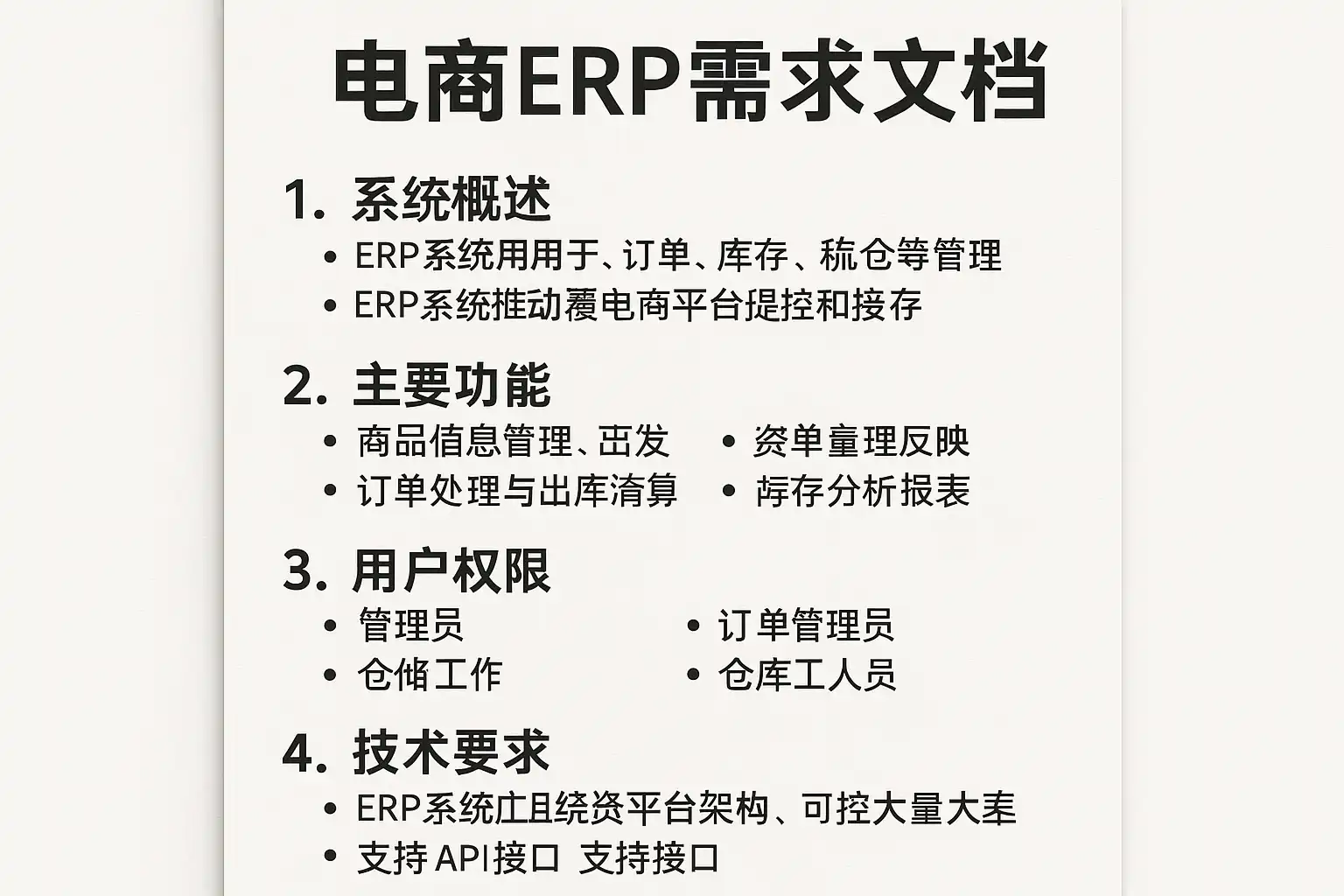 基于上述分析,一个高质量的电商ERP需求文档模板应包含以下结构: