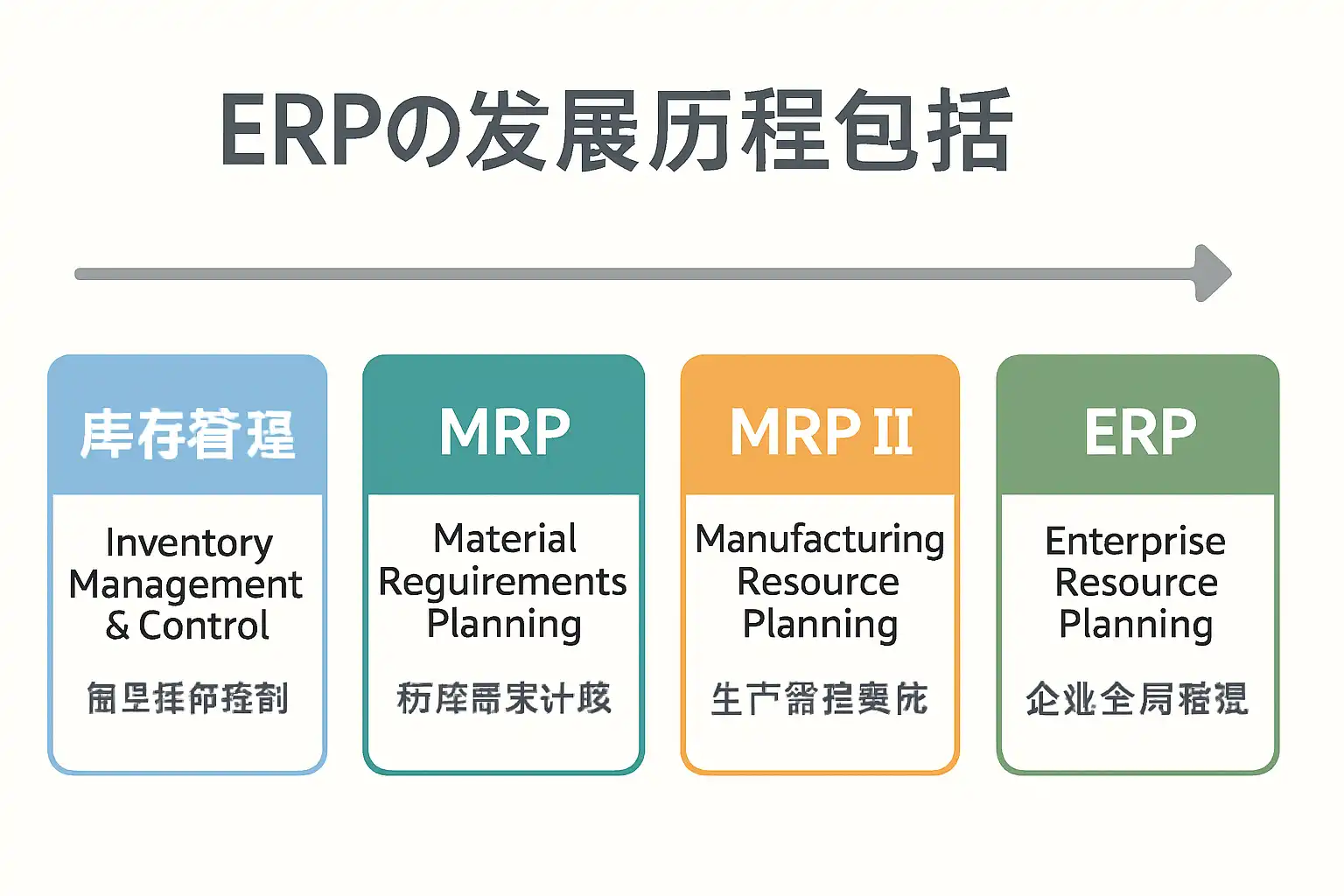 - MRP II阶段(20世纪80年代):扩展到生产计划和控制,融合更多制造资源。