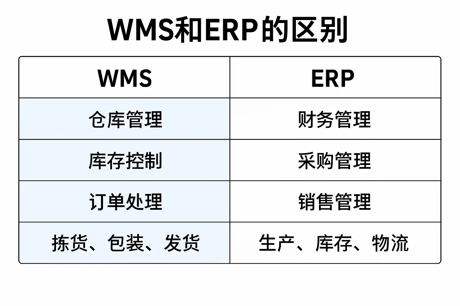 | 主要功能 | 专注于仓库操作,如库存管理、拣货、入库和出库 | 涵盖财务、人力资源、采购、生产计划等企业全面业务 |