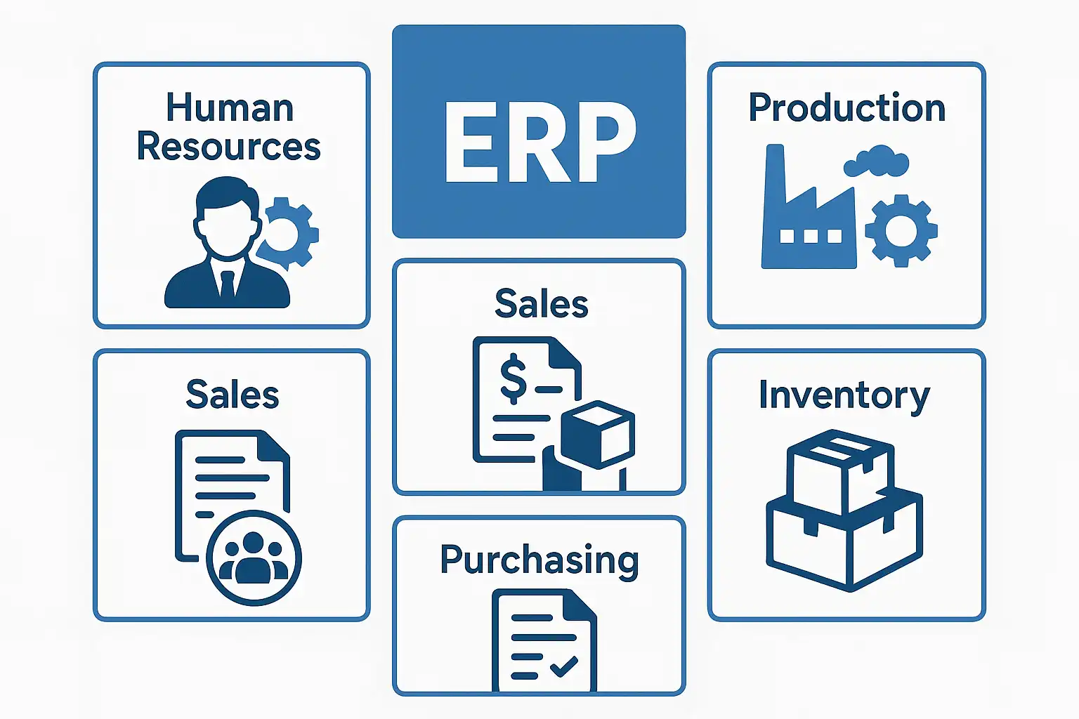 ERP(Enterprise Resource Planning,企业资源计划)系统以其高度集成性,为各类企业提供了全面的信息化解决方案。六大核心模块如下所示: