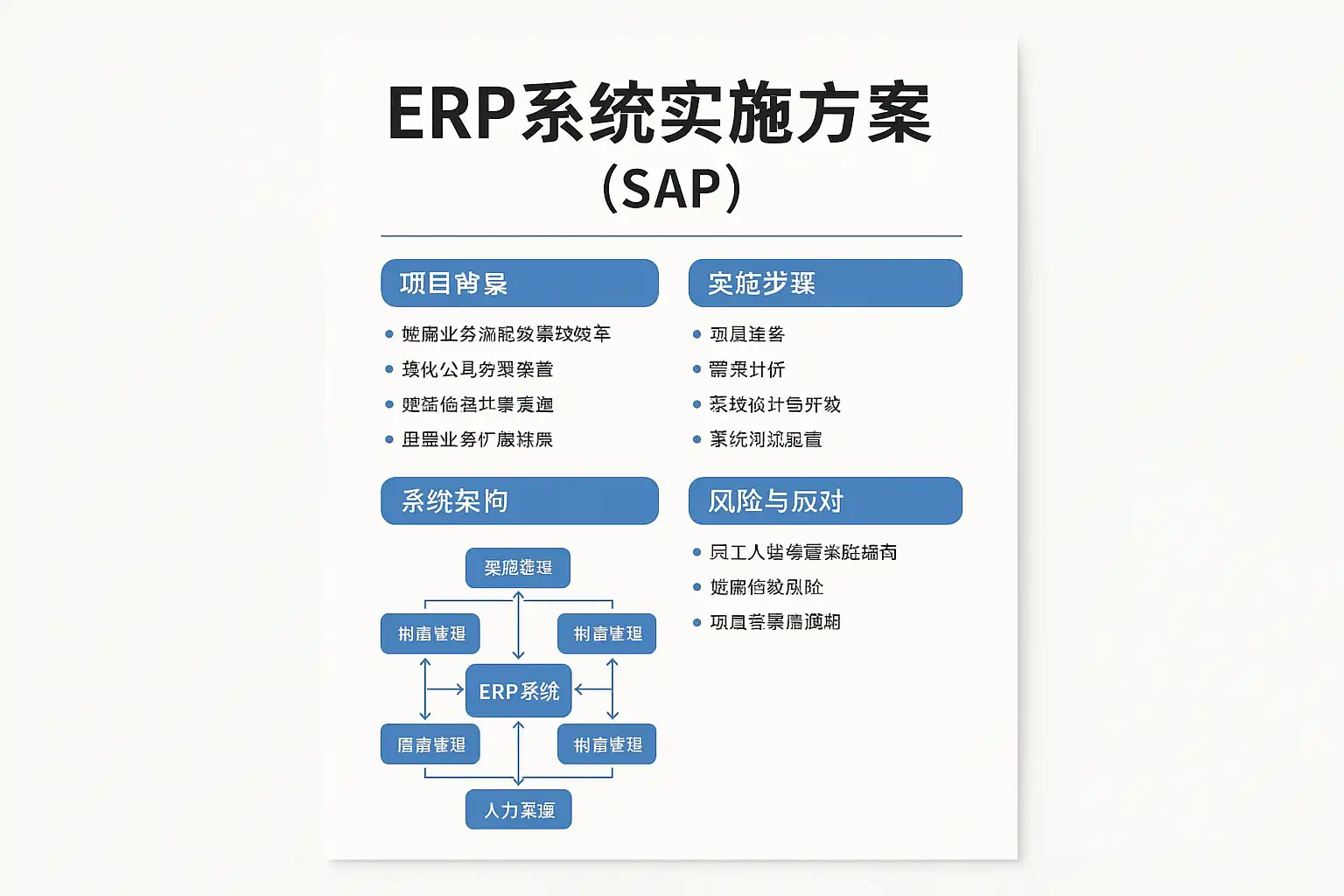 ERP系统实施方案是指企业规划、设计和执行ERP软件部署的全过程。SAP作为全球领先的ERP供应商,通过其模块化设计(如FI财务、MM采购、SD销售等),帮助企业实现资源整合和业务流程优化。例如,某制造企业通过SAP ERP实施方案,实现了订单处理时间缩短30%,库存周转率提升20%,显著提高了运营效率。